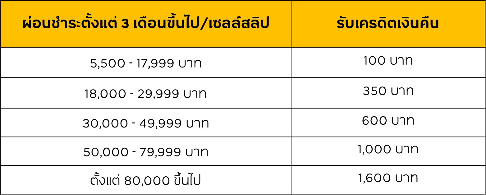 - ยอดการผ่อนชำระแต่ละรายการไม่สามารถนำมาสะสมหรือรวมกันได้ โดยจะคำนวณเครดิตเงินคืนต่อเซลล์สลิป