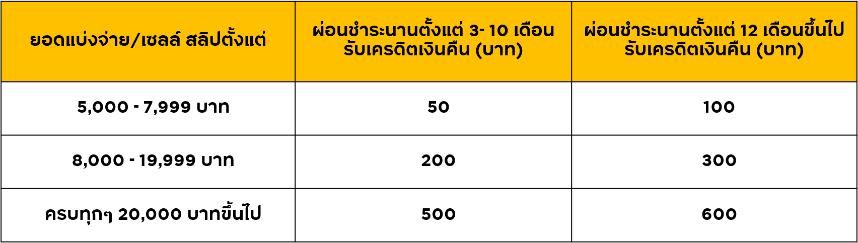 - เครดิตเงินคืนจะคำนวณจากยอดแบ่งจ่ายตั้งแต่ 5,000 บาทขึ้นไปต่อเซลล์สลิป และแบ่งจ่ายตั้งแต่ 3เดือนขึ้นไป