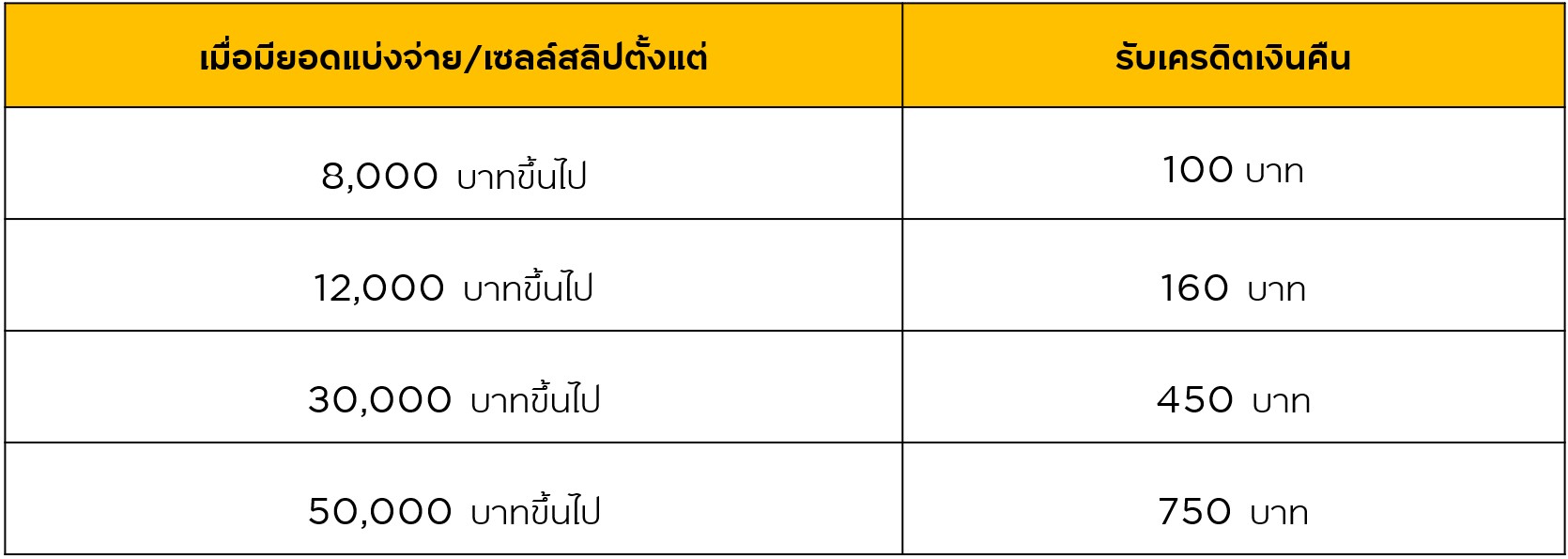- ยอดการแบ่งจ่ายแต่ละรายการไม่สามารถนำมาสะสมหรือรวมกันได้ โดยจะคำนวณเครดิตเงินคืนต่อเซลล์สลิป