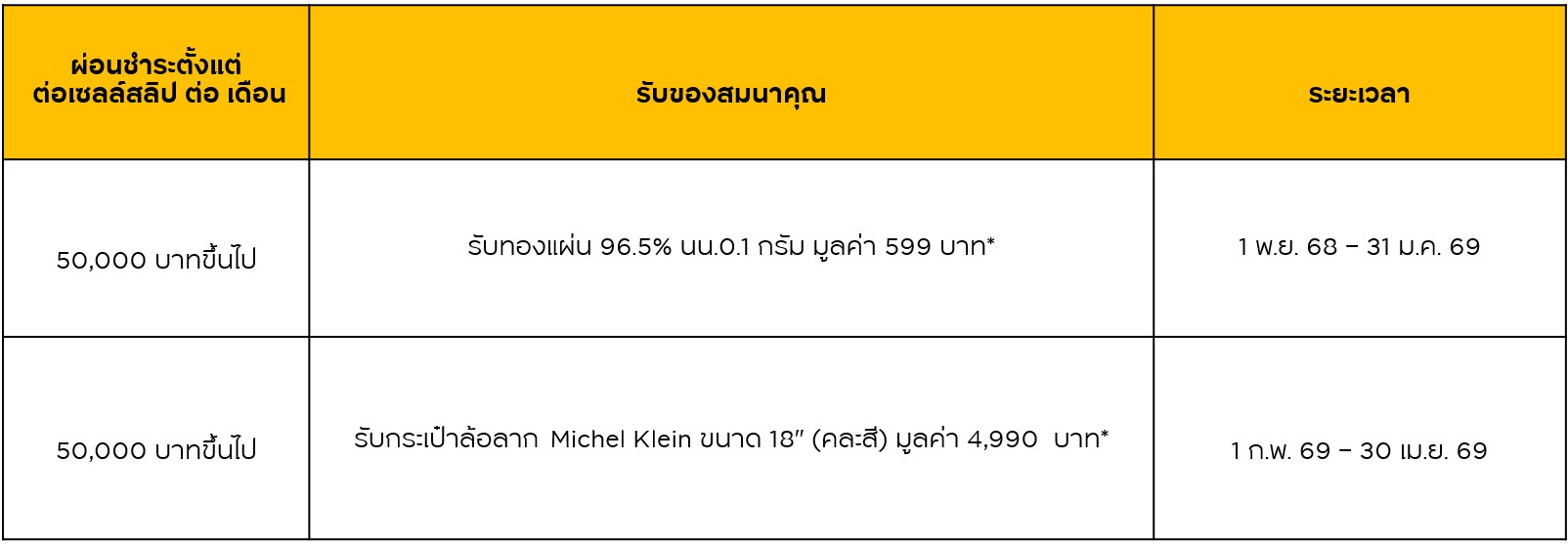 เมื่อมียอดผ่อนชำระตั้งแต่ 50,000 ขึ้นไป / เซลล์สลิปและผ่อนนาน 6 เดือนขึ้นไป