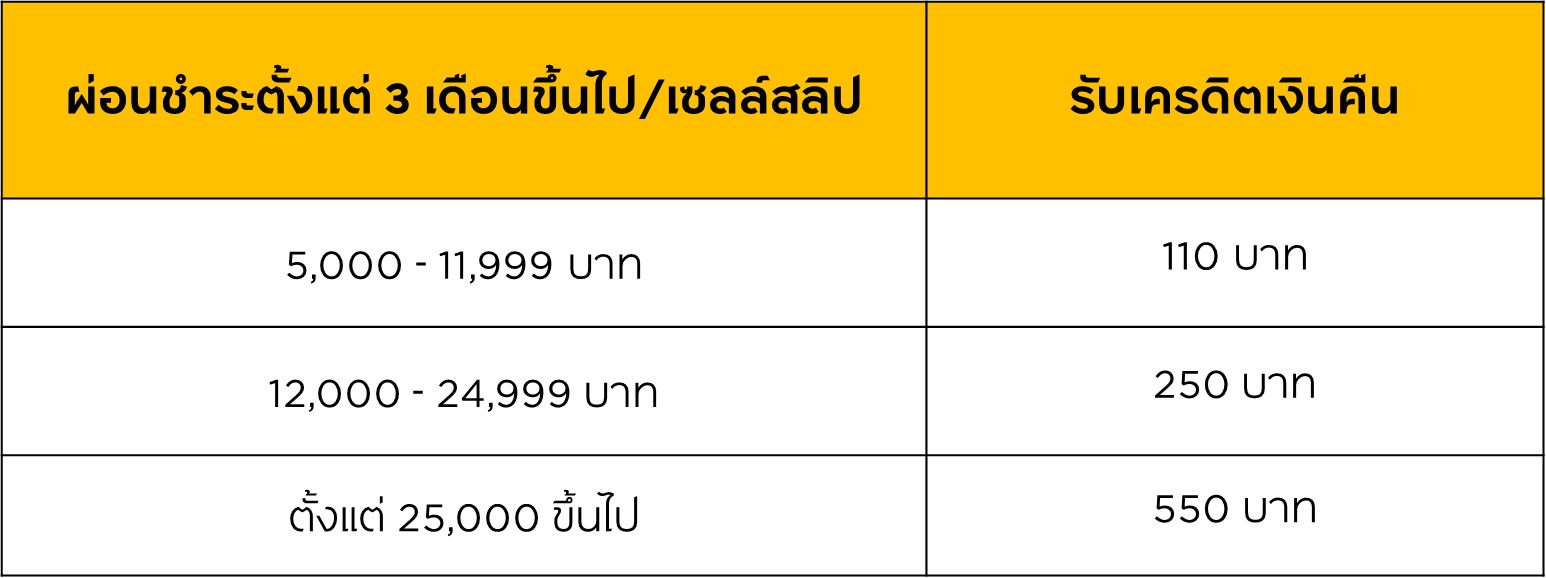 - ยอดการผ่อนชำระแต่ละรายการไม่สามารถนำมาสะสมหรือรวมกันได้ โดยจะคำนวณเครดิตเงินคืนต่อเซลล์สลิป