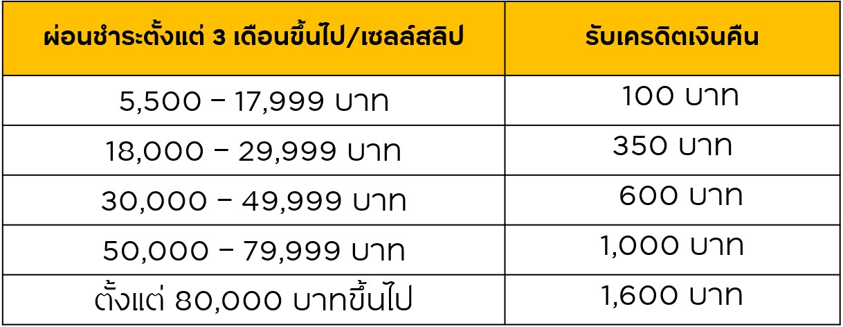 - ยอดการผ่อนชำระแต่ละรายการไม่สามารถนำมาสะสมหรือรวมกันได้ โดยจะคำนวณเครดิตเงินคืนต่อเซลล์สลิป