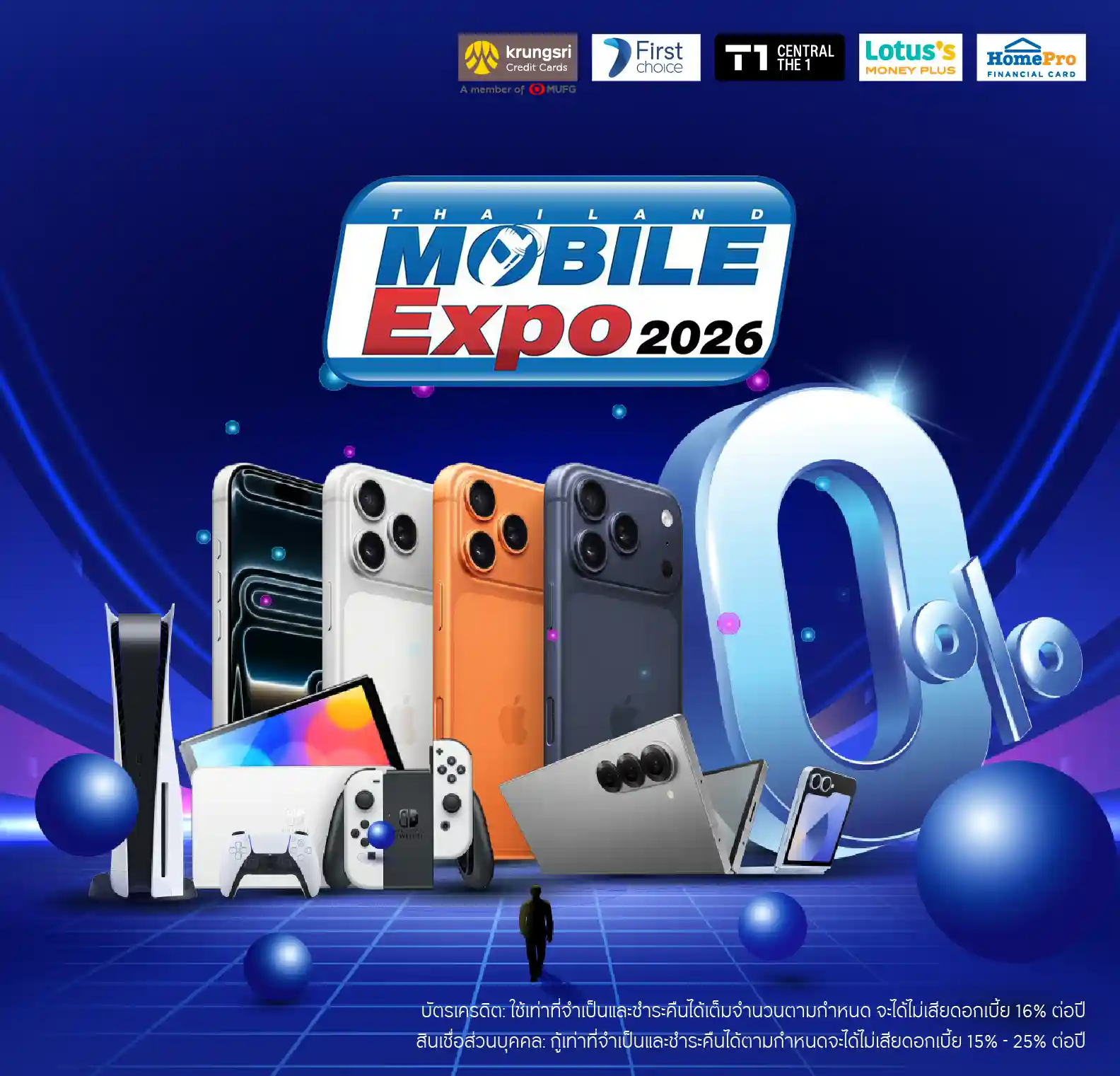 • ต่อที่ 1 ยอดเครดิตเงินคืนจะคำนวณยอดผ่อนชำระตั้งแต่ 12,000 บาทขึ้นไป/เซลส์สลิป และผ่อนชำระนาน 6 เดือนขึ้นไป ที่มียอดใช้จ่ายภายในงาน Thailand Mobile Expo2026 วันที่ 12 มี.ค. 69 – 15 มี.ค. 69 เท่านั้น