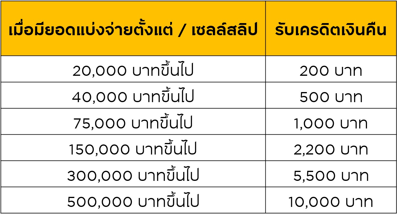 - พิเศษ1 รับเครดิตเงินคืนสูงสุดไม่เกิน 40,000 บาท/หมายเลขบัญชีบัตรหลัก ตลอดรายการ โดยจะคำนวณเครดิตเงินคืนจากยอดแบ่งจ่ายตั้งแต่ 20,000 บาทขึ้นไป/เซลลล์สลิป