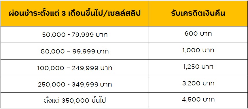- ยอดการผ่อนชำระแต่ละรายการไม่สามารถนำมาสะสมหรือรวมกันได้ โดยจะคำนวณเครดิตเงินคืนต่อเซลล์สลิป
