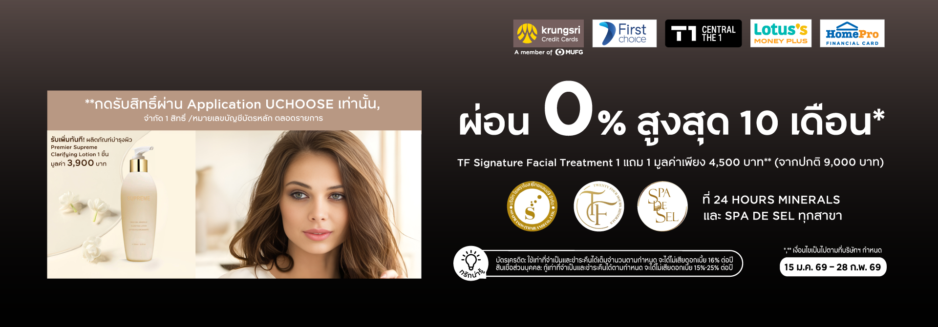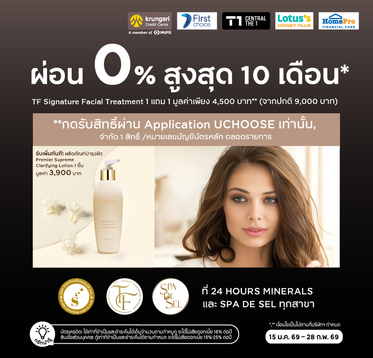 • สิทธิพิเศษเฉพาะสมาชิกบัตรในเครือกรุงศรีคอนซูมเมอร์ทุกประเภทเท่านั้น รับ E-COUPON รับสิทธิพิเศษผ่อนชำระ 0% โปรแกรม TF Signature Facial Treatment มูลค่า 4,500 บาท พร้อมรับเพิ่ม ผลิตภัณฑ์บำรุงผิว Premier Supreme Clarifying Lotion 1 ชิ้น มูลค่า 3,900 บาท จากร้านค้าที่ร่วมรายการ