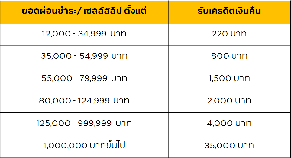 • ยอดผ่อนชำระแต่ละรายการไม่สามารถนำมาสะสมหรือรวมกันได้ โดยจะคำนวณเครดิตเงินคืนจากยอดผ่อนชำระตั้งแต่ 12,000 บาทขึ้นไป ต่อเซลล์สลิป รับเครดิตเงินคืนสูงสุดไม่เกิน 35,000 บาท ต่อเซลล์สลิป และสูงสุดไม่เกิน 35,000 บาท ต่อหมายเลขบัญชีบัตรหลักตลอดรายการ