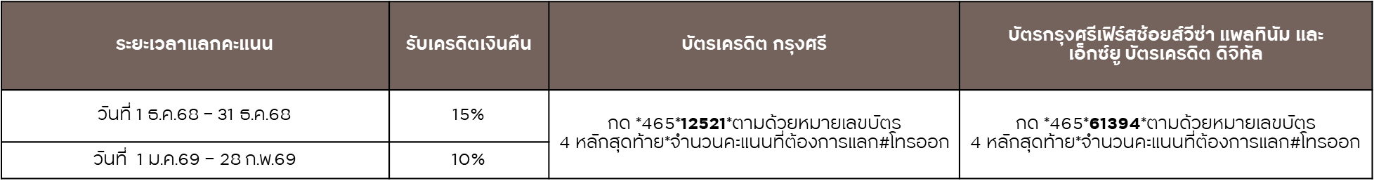 • สำหรับการทำรายการแลกคะแนนวันที่ 1 ธ.ค.68 – 31 ธ.ค.68 ใช้คะแนนสะสมแลกรับเครดิตเงินคืน 15% เมื่อมียอดผ่อนชำระ 5,000 บาทขึ้นไปต่อเซลล์สลิป เครดิตเงินคืน 15% คำนวณจากยอดคะแนนสะสมที่แลก ผู้ถือบัตรสามารถใช้คะแนนสะสมตั้งแต่ 5,000 คะแนนขึ้นไป และสูงสุดไม่เกินยอดผ่อนชำระต่อเซลล์สลิป
