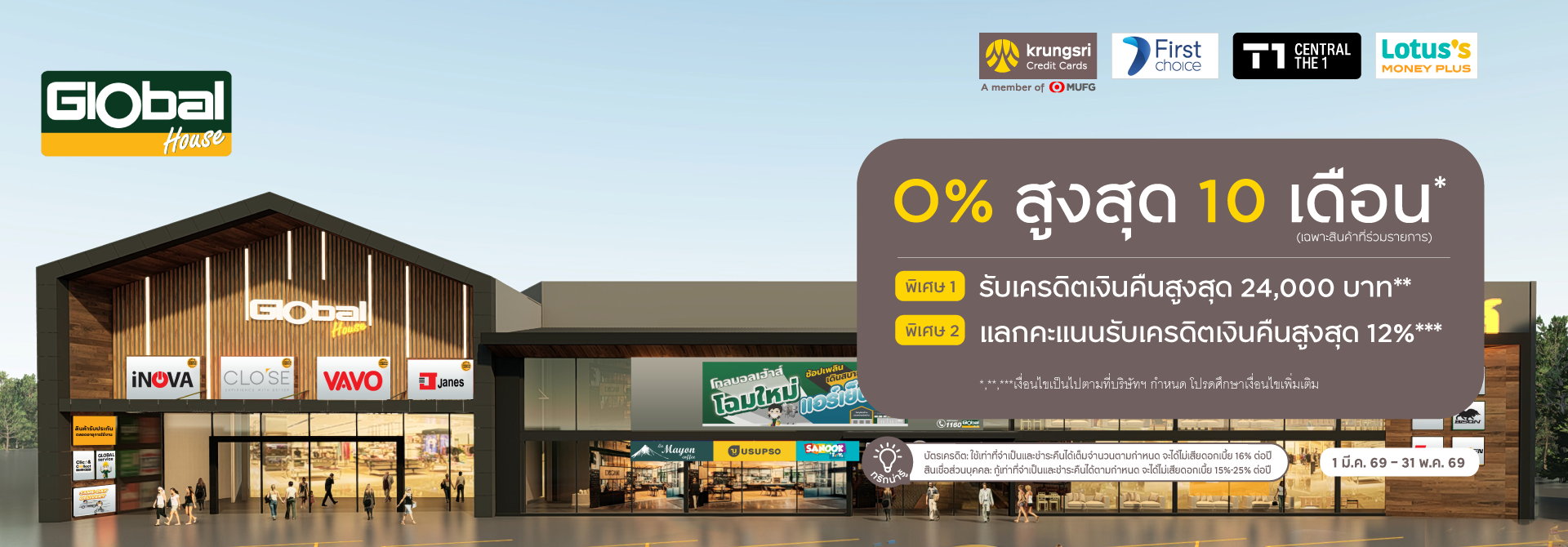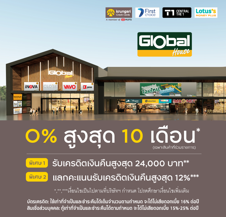 • รายการส่งเสริมการขายนี้สามารถใช้ร่วมกับการผ่อนชำระผ่านช่องทางออนไลน์ www.globalhouse.co.th ได้