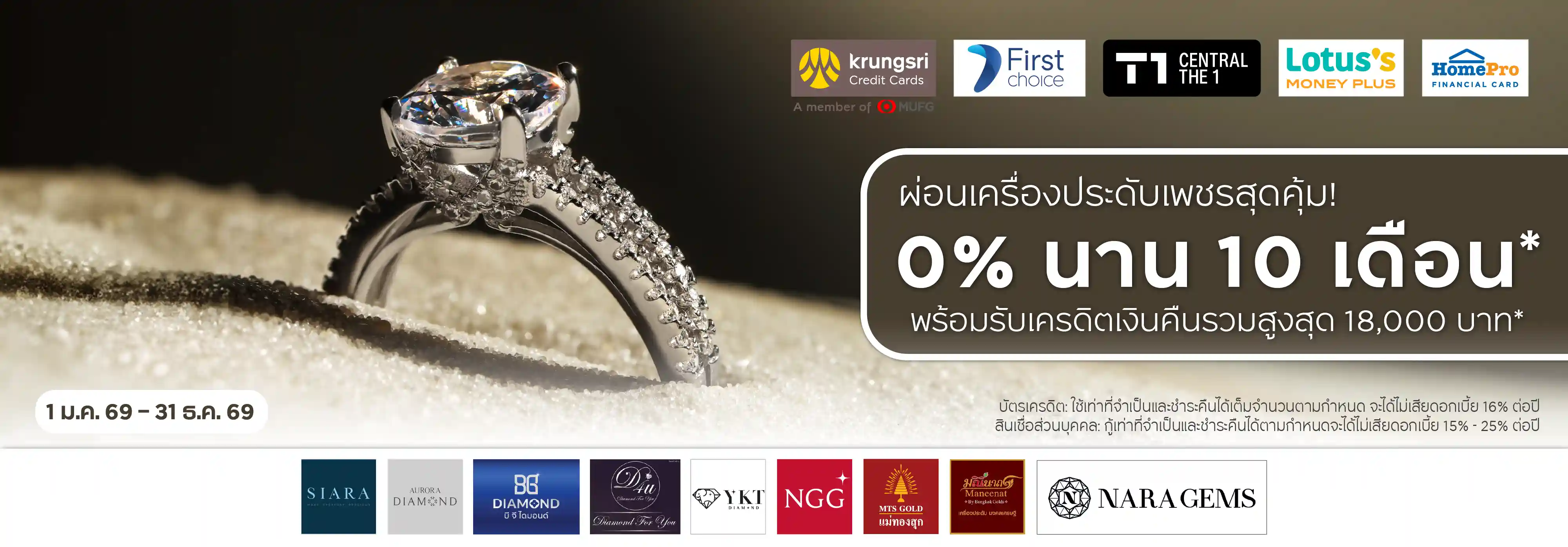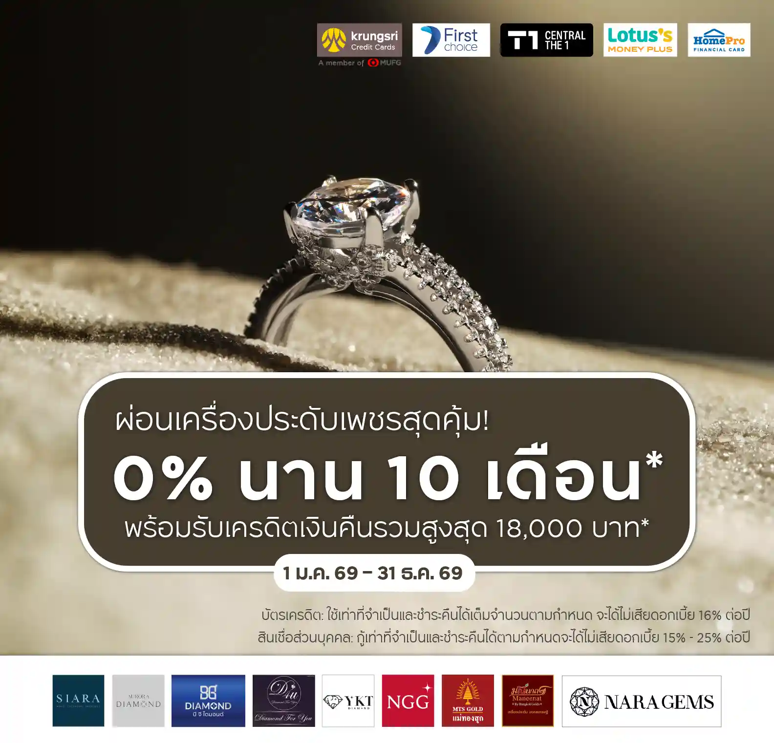 ผ่อนเครื่องประดับเพชร 0% พร้อมรับเครดิตเงินคืนสูงสุด 18,000 บาท*