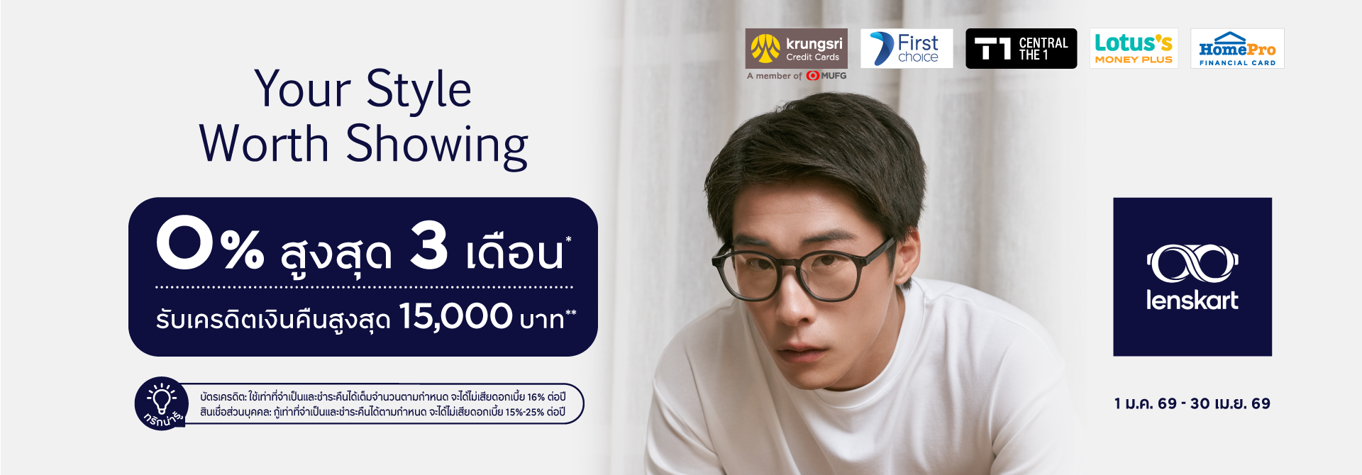 • ยอดเครดิตเงินคืนจะคำนวณยอดผ่อนชำระตั้งแต่ 8,000 บาทขึ้นไป/เซลล์สลิป ภายในวันที่ 1 ม.ค. 69 – 30 เม.ย. 69 เท่านั้น
