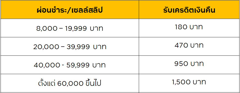 • ยอดการผ่อนชำระแต่ละรายการไม่สามารถนำมาสะสมหรือรวมกันได้ โดยจะคำนวณเครดิตเงินคืนต่อเซลล์สลิป