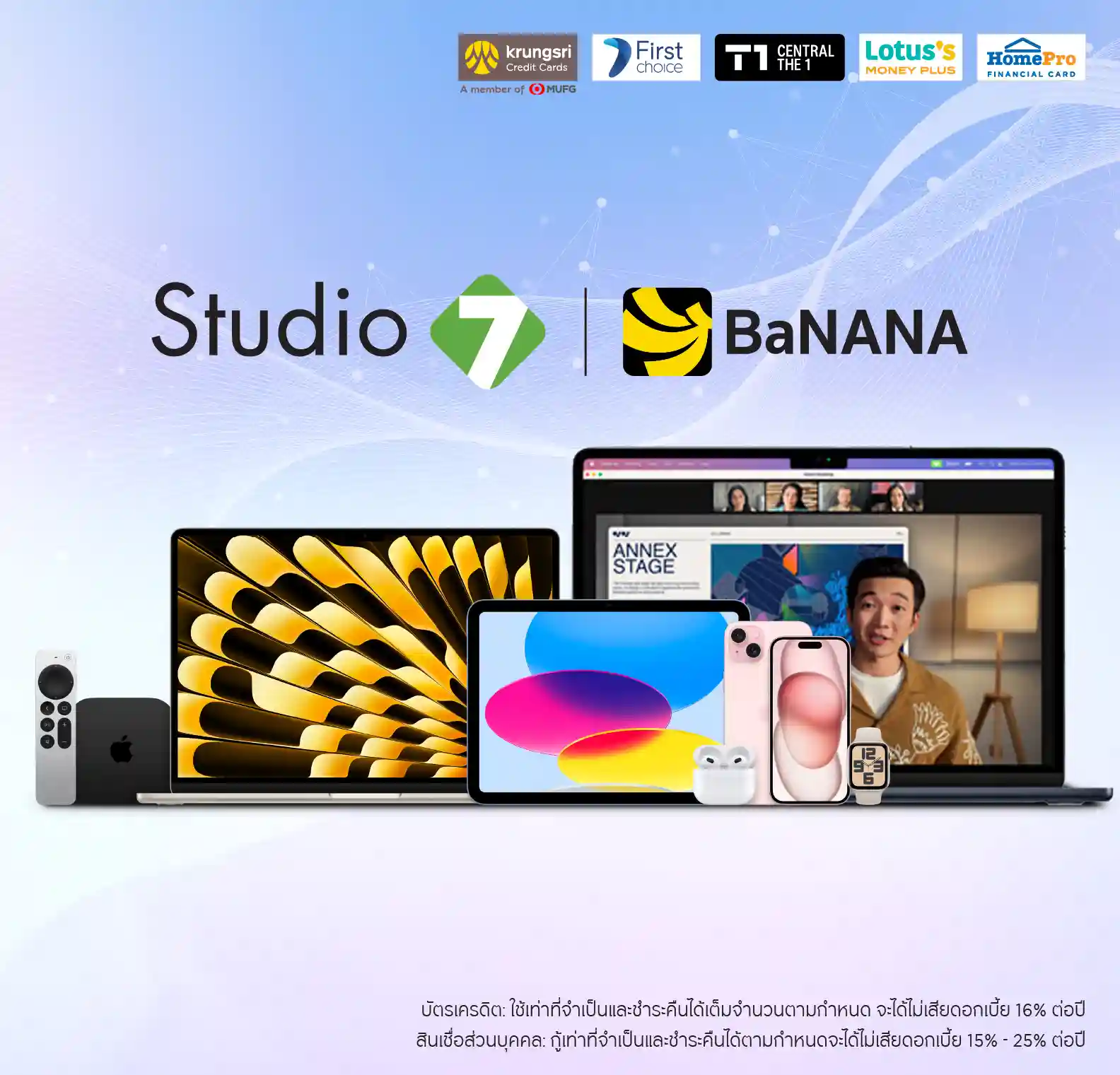 • สำหรับบัตรเครดิต กรุงศรี, บัตรเครดิต เซ็นทรัล เดอะวัน และบัตรเครดิตโลตัส ผ่อน 0% นานสูงสุด 10 เดือน* หรือผ่อนอัตราดอกเบี้ยพิเศษ 0.69%-0.74% ต่อเดือน นานสูงสุด 10 เดือน เท่ากับ 12.38%-15.83% ต่อปี