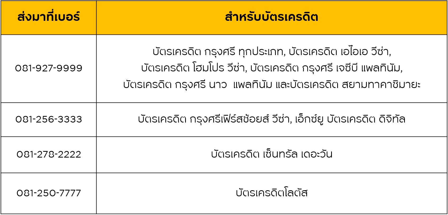 - สิทธิพิเศษนี้เฉพาะบัตรเครดิตในกลุ่มกรุงศรีที่ร่วมรายการ ได้แก่ สำหรับสมาชิกบัตรเครดิต กรุงศรี ทุกประเภท, บัตรเครดิต เอไอเอ วีซ่า, บัตรเครดิต โฮมโปร วีซ่า, บัตรเครดิต กรุงศรี เจซีบี แพลทินัม, บัตรเครดิต กรุงศรี นาว แพลทินัม และบัตรเครดิต สยามทาคาชิมายะ, บัตรเครดิต เซ็นทรัล เดอะวัน , บัตรเครดิตโลตัส, บัตรเครดิต กรุงศรีเฟิร์สช้อยส์ วีซ่า และเอ็กซ์ยู บัตรเครดิต ดิจิทัล เท่านั้น (ไม่รวมถึงบัตรเครดิต กรุงศรี คอร์ปอเรท การ์ด, บัตรเครดิต ทีซีซี พริวิเลจ การ์ด และ บัตรเครดิต กรุงศรี โฮมโปร คอร์ปอเรท การ์ด)