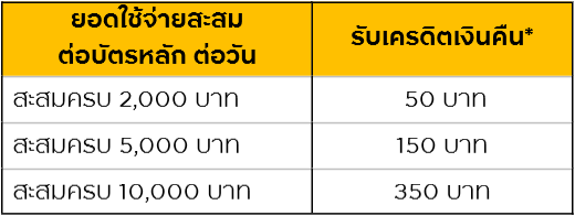 - ยอดใช้จ่ายสะสมจากแต่ละรายการ ต่อหมายเลขบัตรหลัก ต่อวัน สามารถนำมาสะสมหรือรวมกันได้ โดยจะคำนวณเครดิตเงินคืนจากยอดใช้จ่ายสะสมครบ 2,000.00 - 4,999.99 บาทต่อวัน รับเครดิตเงินคืน 50 บาท สำหรับยอดใช้จ่ายสะสมครบ 5,000.00 - 9,999.99 บาทต่อวัน รับเครดิตเงินคืน 150 บาท สำหรับยอดใช้จ่ายสะสมครบ 10,000 บาทขึ้นไปต่อวัน รับเครดิตเงินคืน 350 บาท