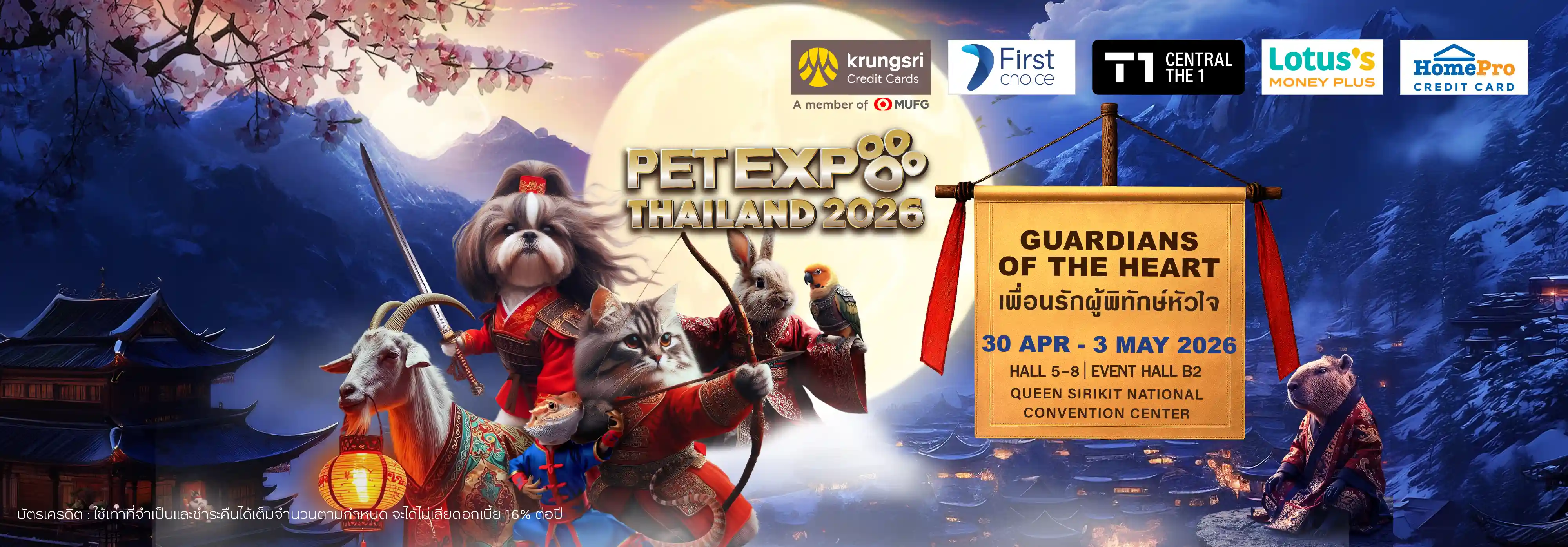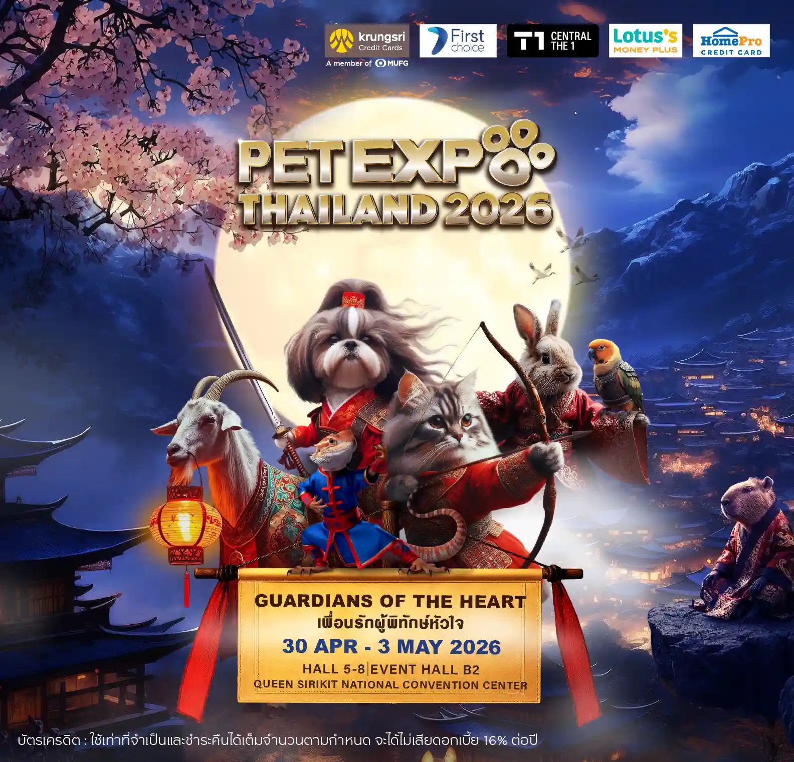 - สงวนสิทธิ์การมอบเครดิตเงินคืน บัตรกำนันห้องพัก และของสมนาคุณเฉพาะท่านที่ลงทะเบียน ณ จุดลงทะเบียนของบัตรเครดิตในกลุ่มกรุงศรี คอนซูมเมอร์ (บริเวณประตูทางเข้า Hall 8) โดยแสดงบัตรเครดิต บัตรประชาชน และเซลล์สลิป สำหรับยอดใช้จ่ายสะสมภายใต้ ชื่อเจ้าของบัตรและหมายเลขบัตรเครดิตเดียวกัน ที่ใช้จ่ายภายในงาน “PET EXPO THAILAND 2026” ภายในวันเดียวกัน ณ ศูนย์การประชุมแห่งชาติสิริกิติ์ ระหว่างวันที่ 30 เม.ย. 69 - 3 พ.ค. 69 (4 วันเท่านั้น)