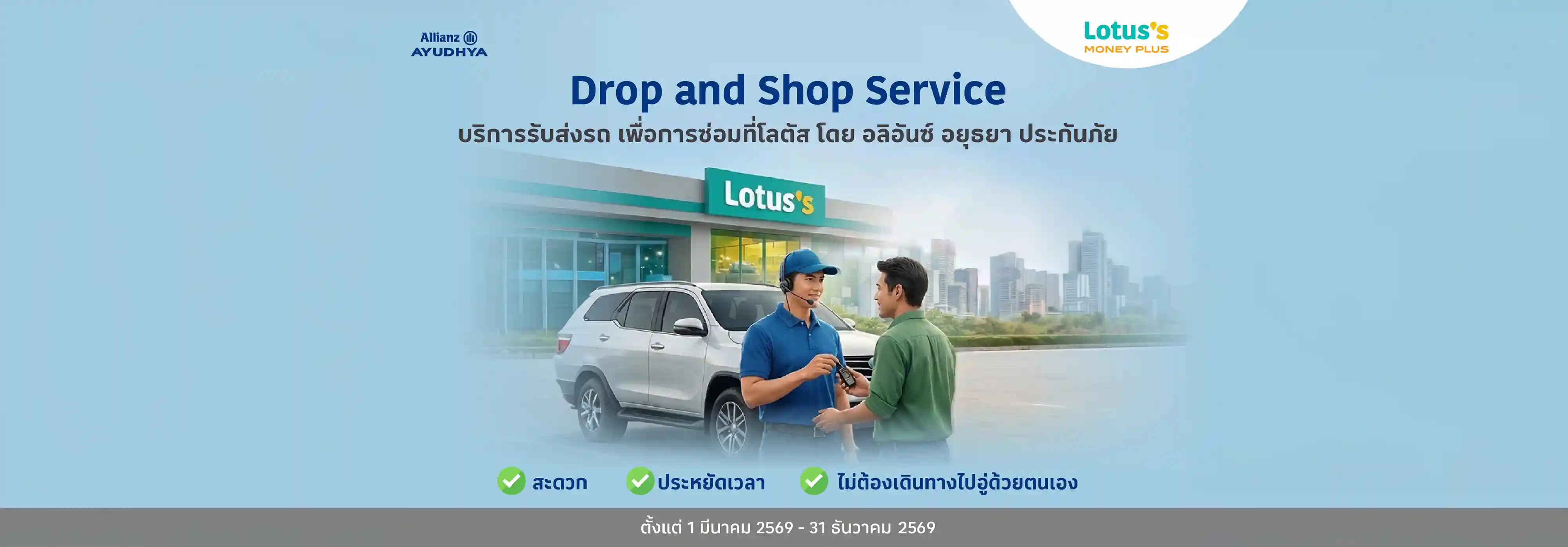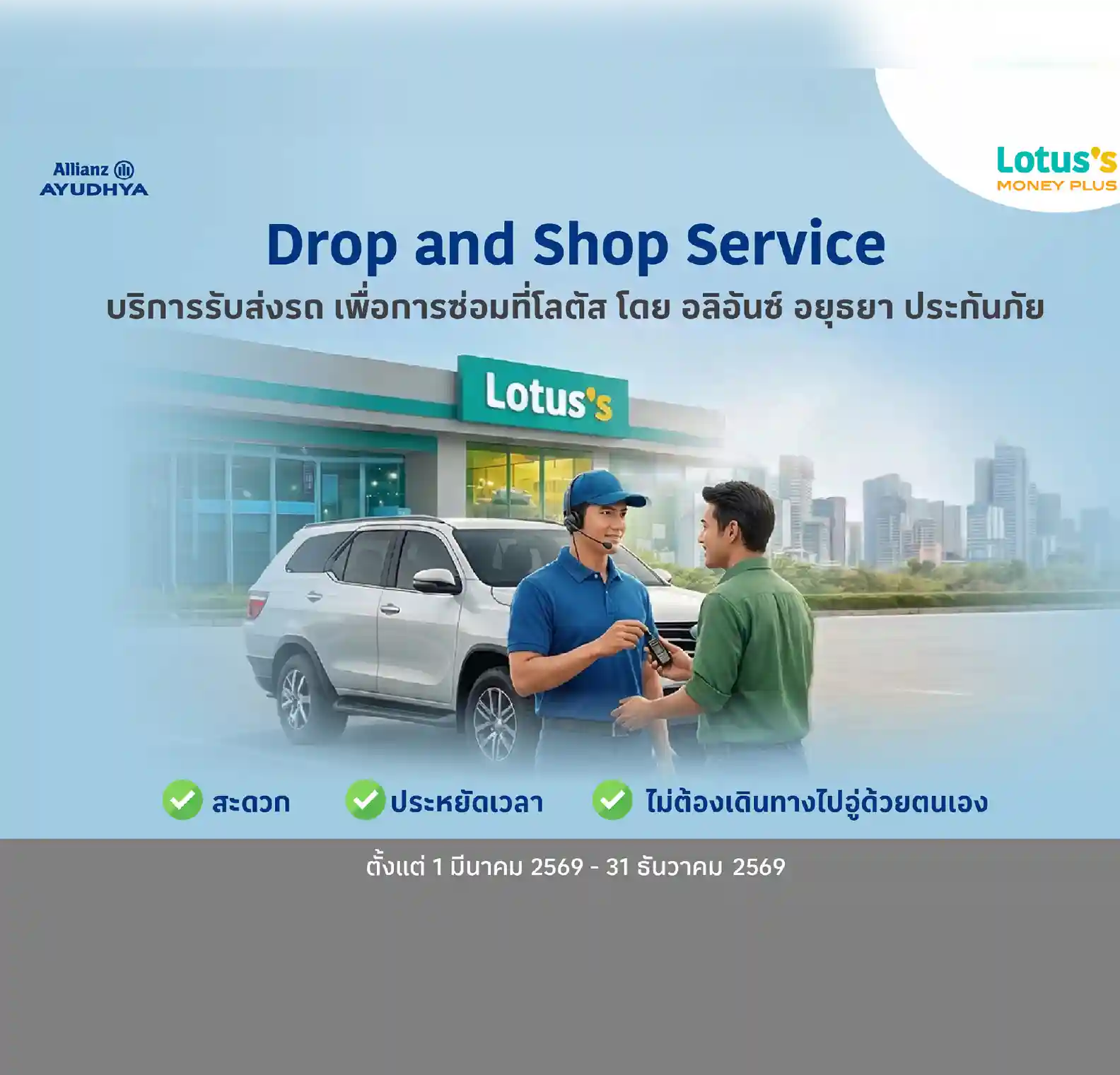 กรุงเทพฯ – 23 เมษายน 2569 : โลตัส มันนี่ พลัส ร่วมกับ อลิอันซ์ อยุธยา ประกันภัย ยกระดับบริการ เปิดบริการใหม่ “Drop and Shop Service” ตั้งแต่ 1 มีนาคม 2569 – 31ธันวาคม 2569 บริการรับ-ส่งรถเพื่อการซ่อมที่โลตัส โดยอลิอันซ์ อยุธยา ประกันภัย บริการนัดหมายรับ-ส่งรถซ่อมผ่านห้างโลตัสใกล้บ้าน สำหรับลูกค้าโลตัส มันนี่พลัสที่ซื้อประกันภัยรถยนต์อลิอันซ์ อยุธยาผ่านโลตัสส์ อินชัวร์รันส์ โบรคเกอร์ แบบความคุ้มครองเพิ่มเติมพิเศษ “All in One Care” เพิ่มความสะดวกยิ่งขึ้น ในการนัดหมาย รับ ส่ง รถซ่อม โดยไม่ต้องเดินทางไปอู่ด้วยตนเอง เพียงติดต่อศูนย์บริการลูกค้าอลิอันซ์ อยุธยา ประกันภัย (AAGI) โทร 1292 เพื่อขอใช้บริการและนัดหมายอู่ซ่อมรถที่เข้าร่วมโครงการ (ระยะไม่เกิน 10 กิโลเมตรจากจุดรับ – ส่งรถ) โดยอู่คู่สัญญาที่ได้รับมอบหมายจะโทรศัพท์หาลูกค้า เพื่อยืนยันการนัดหมายและสอบถามข้อมูลเบื้องต้นของการเคลม และลูกค้าสามารถนำรถยนต์มาฝากไว้ที่โลตัสเฉพาะสาขาที่มีเคาน์เตอร์โลตัส มันนี่ พลัสให้บริการ ซึ่งเป็นจุดนัดหมายหลังซ่อมเสร็จอู่จะโทรนัดลูกค้า เพื่อนำรถมาส่งคืนที่สาขาโลตัสบริการนี้สำหรับลูกค้าผู้ถือกรมธรรม์ประกันภัยของอลิอันซ์ อยุธยา ประกันภัย ที่ซื้อประกันผ่านโลตัสส์ อินชัวร์รันส์ โบรคเกอร์ และมีเงื่อนไขการให้บริการเป็นไปตามที่บริษัทประกันภัยกำหนด ข้อมูลเพิ่มเติม คลิก