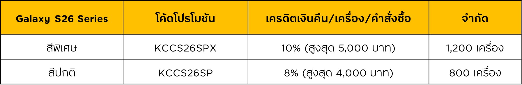 • สิทธิพิเศษสำหรับลูกค้าทำรายการผ่อนชำระ ที่กรอกโค้ด KCCS26SPX ที่ช่อง กรอกโค้ดโปรโมชั่น สำหรับการสั่งซื้อสีพิเศษ หรือ กรอกโค้ด KCCS26SP ที่ช่อง กรอกโค้ดโปรโมชั่น สำหรับการสั่งซื้อสีปกติ เพื่อรับเครดิตเงินคืน ก่อนชำระเงินแบบผ่อนชำระด้วยบัตรเครดิตในกลุ่มกรุงศรี คอนซูมเมอร์ที่ www.samsung.com เท่านั้น